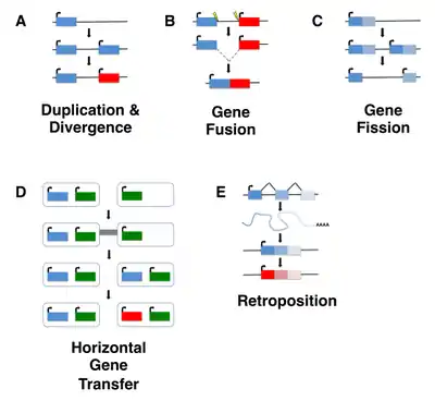 Novel genes can be formed from ancestral genes through a variety of mechanisms.[1] (A) Duplication and divergence. Following duplication, one copy experiences relaxed selection and gradually acquires novel function(s). (B) Gene fusion. A hybrid gene formed from some or all of two previously separate genes. Gene fusions can occur by different mechanisms; shown here is an interstitial deletion. (C) Gene fission. A single gene separates to form two distinct genes, such as by duplication and differential degeneration of the two copies.[2] (D) Horizontal gene transfer. Genes acquired from other species by horizontal transfer undergo divergence and neofunctionalization. (E) Retroposition. Transcripts may be reverse transcribed and integrated as an intronless gene elsewhere in the genome. This new gene may then undergo divergence.