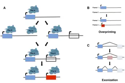 Novel genes can emerge from ancestrally non-genic regions through poorly understood mechanisms. (A) A non-genic region first gains transcription and an open reading frame (ORF), in either order, facilitating the birth of a de novo gene. The ORF is for illustrative purposes only, as de novo genes may also be multi-exonic, or lack an ORF, as with RNA genes. (B) Overprinting. A novel ORF is created that overlaps with an existing ORF, but in a different frame. (C) Exonization. A formerly intronic region becomes alternatively spliced as an exon, such as when repetitive sequences are acquired through retroposition and new splice sites are created through mutational processes. Overprinting and exonization may be considered as special cases of de novo gene birth.