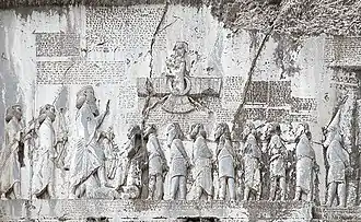 In 1798, Oluf Gerhard Tychsen made the first study of the inscriptions of Persepolis copied by Niebuhr.[22] He discovered that series of characters in the Persian inscriptions were divided from one another by an oblique wedge (𐏐) and that these must be individual words. He also found that a specific group of seven letters (𐎧𐏁𐎠𐎹𐎰𐎡𐎹) was recurring in the inscriptions, and that they had a few recurring terminations of three to four letters.[22] However, Tychsen mistakenly attributed the texts to Arsacid kings, and therefore was unable to make further progress.[22]