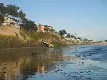 Del Playa Drive has also been a source of housing controversy, as some of the apartment buildings are falling off of the rapidly eroding cliffs.[35] Recently, however, steps have been taken to slow the erosion by reinforcing the cliffs with imported rock, concrete and other artificial support structures, and by redirecting water runoff through the cliffs, rather than over them as it would flow naturally.[36]