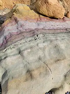 ![]() A broken-off piece of a cliff on the Torrey Pines beach. Delmar Formation (green, bottom) transitioning to Torrey Sandstone (yellow, top). | |