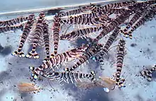 Prawns are an attractive food for predators, with a higher energy content than most other invertebrates.[48] The larvae are prey to comb jellies, jellyfish, chaetognaths, fish and other crustaceans (such as mantis shrimp and crabs), and only a tiny proportion survive.[49] Juveniles are targeted by a number of fish, cephalopods and birds; Litopenaeus vannamei juveniles experience 90% mortality in the 6–12 weeks they spend in Mexican lagoons, and this is thought to be due almost entirely to predation.[49] Adult prawns are less susceptible to predation, but can fall prey to some fish.[50]