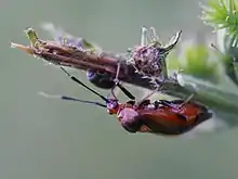 The nymph of Deraeocoris ruber is black coloured with a pinkish wide abdomen bearing black spines.[4]