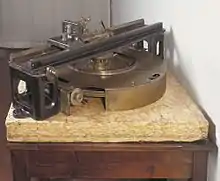 The first true circular dividing engine was probably constructed by Henry Hindley, a clockmaker, around 1739. This was reported to the Royal Society by John Smeaton in 1785.[2] It was based directly on a gear cutting machine for clockworks. It used a toothed index plate and a worm gear to advance the mechanism. Duc de Chaulnes created two dividing engines between 1765 and 1768 for dividing circular arcs and linear scales. He desired to improve on the graduation of instruments by removing the skill of the maker from the technique where possible. While beam compass use was critically dependent on the skill of the user, his machine produced more regular divisions by virtue of its design. His machines were also inspired by the prior work of the clockmakers.