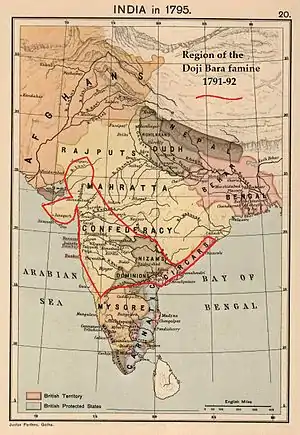 The resulting famine, which was severe, caused widespread mortality in Hyderabad, Southern Maratha Kingdom, Deccan, Gujarat, and Marwar (then all ruled by Indian rulers).[3] In regions like the Madras Presidency (governed by the East India Company), where the famine was less severe,[3] and where records were kept, half the population perished in some districts, such as in the Northern Circars.[4] In other areas, such as Bijapur, although no records were kept, both the famine and the year 1791 came to be known in folklore as the Doji bara (also Doĝi Bar) or the "skull famine," on account, it was said, of the "bones of the victims which lay unburied whitening the roads and the fields."[5] As in the Chalisa famine of a decade earlier, many areas were depopulated from death or migration. According to one study, a total of 11 million people may have died during the years 1789–1792 as a result of starvation or accompanying epidemics of disease.[6]