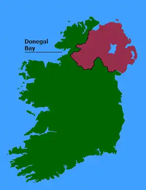 Donegal Bay (Irish: Bá Dhún na nGall) is an inlet (or bay) in the northwest of Ireland. Three counties – Donegal to the north and west, Leitrim and Sligo to the south – have shorelines on the bay, which is bounded on the west by the Atlantic Ocean. The town of Donegal and the River Eske lie at the head of the bay.