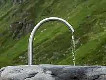 In Nepal there were public drinking fountains at least as early as 550 AD.[7] They are called dhunge dharas or hitis. They consist of carved stone spouts through which water flows uninterrupted from underground sources. They are found extensively in Nepal and some of them are still operational. Many people of Nepal rely on them for their daily water supply.[8] The tutedhara or jahru is another type of old drinking fountain found in Nepal. This is a stone container that can be filled with water and has a tap that can be opened and closed. The oldest of these is dated 530 AD. Very few jahrus are in use today, but the remnants can be found in many places.[9]
