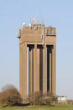 The tower stands on top of Yew Tree Hill, to the south-east of the town of Droitwich Spa, and is visible from long distances.[1][2] It was constructed in 1962 by the East Worcestershire Waterworks Company to house a tank containing 150,000 imperial gallons (680,000 L) of water, to improve the local supply pressure.[1][3] The tower stands 110 feet (34 m) tall and was constructed by Currall, Lewis and Martin Ltd. for the cost of £35,000.[1][3][4] The tank is supported on 12 square columns, each 81 feet (25 m) high, around the perimeter of the square structure.[3][4] The columns are remarkable for their comparative slenderness.[3] A square service shaft in the centre passes through the tank to give access to the tank and roof.[3][4]