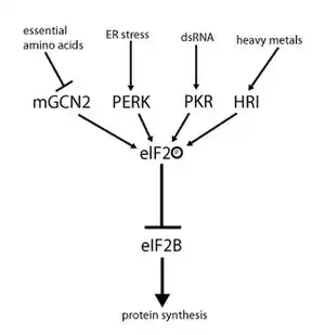 eIF2 activity is regulated by a mechanism involving both guanine nucleotide exchange and phosphorylation. Phosphorylation takes place at the α-subunit, which is a target for a number of serine kinases that phosphorylate serine 51. Those kinases act as a result of stress such as amino acid deprivation (GCN2), ER stress (PERK), the presence of dsRNA (PKR) heme deficiency (HRI), or interferon.[10] Once phosphorylated, eIF2 shows increased affinity for eIF2B, its GEF. However, eIF2B is able to exchange GDP for GTP only if eIF2 is in its unphosphorylated state. Phosphorylated eIF2, however, due to its stronger binding, acts as an inhibitor of its own GEF (eIF2B). Since the cellular concentration of eIF2B is much lower than that of eIF2, even a small amount of phosphorylated eIF2 can completely abolish eIF2B activity by sequestration. Without the GEF, eIF2 can no longer be returned to its active (GTP-bound) state. As a consequence, translation comes to a halt since initiation is no longer possible without any available ternary complex. Furthermore, low concentration of ternary complex allows the expression of GCN4 (starved condition), which, in turn, results in increased activation of amino acid synthesis genes[2][3][4][9][11]