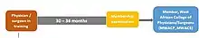 Upon gaining admission into the residency program in an accredited institution, the first examination is usually written after a specified period of training ranging from 24 months to 36 months, with success translating to a registrar's promotion to a Senior Registrar. The second examination holds after another period of a minimum of 24 months to 36 months, where the resident is expected to produce a thesis and be involved in the training of junior residents and medical students. He then becomes a fellow at the training's expiration and is expected to exit the training program six months after passing the final examination. He may be appointed a Consultant at the same institution if vacancies exist or at another facility.
