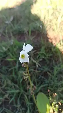 Leaves long-petioled, petioles 1.5 - 3 x longer than the blades. Blades oval, ovate or cordate, at the tip obtuse or shortly acuminate, at the base lobate or abrupt, 9 – 11 cm long x 7 – 8 cm wide, in the terrestrial forms often only 3 cm long x 2 cm wide. Submersed blades oval or ovate, often nearly rounded. Blades trimmed with pellucid lines to 2 mm long. Stem erect, longer than the leaves, glabrous or rarely scabrous, 30 – 80 cm long. Inflorescence racemose having 3 - 9 whorls containing 6 - 12 flowers each, proliferous. Bracts as long as the pedicels, or hardly longer, to 1.5 cm long, having 9 - 11 ribs and membraneous margins. Pedicels usually 1 - (2.5) cm long, sepals 5 – 6 mm long having 16 - 20 undistinct ribs, petals white, 1.7 – 2 cm long, corolla 2.5 – 4 cm in diameter. Stamens 20 - 25, anthers as long as the filaments, pistils numerous. Aggregate fruit globular or ovate, 5 – 7 mm in diameter. Achenes 2 - 2.3 mm long x 0.9 – 1 mm wide having usually 4 lateral ribs and (1) - 3 glands placed in a row in the upper half of the body. Beak erect or bent, 0.5 mm long.[2][3][4]