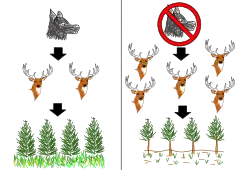 A simple trophic cascade diagram. On the right shows when wolves are absent, showing an increase in elks and reduction in vegetation growth. The left one shows when wolves are present and controlling the elk population.