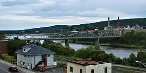 The Edmundston–Madawaska Bridge is an international bridge which connects the cities of Edmundston, New Brunswick, in Canada and Madawaska, Maine, in the United States, across the Saint John River.[1] The bridge consists of four steel through truss spans, each 70.71 metres (232.0 ft) in length, for a total length of 287.12 metres (942.0 ft), which carries a two lane open steel grid deck roadway.