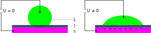 Electrowetting using an insulating layer on top of a bare electrode was later studied by Bruno Berge in 1993.[6] Electrowetting on this dielectric-coated surface is called electrowetting-on-dielectric (EWOD)[7] to distinguish it from the conventional electrowetting on the bare electrode. Electrowetting can be demonstrated by replacing the metal electrode in the EWOD system by a semiconductor.[8][9] Electrowetting is also observed when a reverse bias is applied to a conducting droplet (e.g. mercury) which has been placed directly onto a semiconductor surface (e.g. silicon) to form a Schottky contact in a Schottky diode electrical circuit configuration – this effect has been termed ‘Schottky electrowetting’.[10]