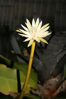 Epiphyllum phyllanthus, commonly known as the climbing cactus, is a species of epiphytic cacti. It has no leaves, instead having stems that photosynthesise. It is thought to be pollinated by hawkmoths, as the flowers only open at night and produce a strong fragrance.[2]