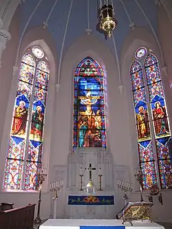 The eternal flame was a component of the Jewish religious rituals performed in the Tabernacle and later in the Temple in Jerusalem, where a commandment required a fire to burn continuously upon the Outer Altar.[2] Modern Judaism continues a similar tradition by having a sanctuary lamp, the ner tamid, always lit above the ark in the synagogue. After World War II, such flames gained further meaning, as a reminder of the six million Jews killed in the Holocaust. In traditional Christian denominations, such as Catholicism and Lutheranism, a chancel lamp continuously burns as an indication of the real presence of Christ in the Eucharist.[3]