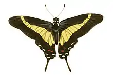 Upperside: Antennae, thorax, and abdomen black. Wings raven black, having a pale yellow bar rising at the anterior edges near the tips of the superior wings, and crossing these and the inferior ones, meeting even with the abdomen, becoming wider gradually. Posterior wings furnished with two tails, and along the external edges having four small yellow crescents, and another at the abdominal corners; above which are two long square red spots, and another yellow crescent on the abdominal edges. Underside: Palpi, legs, and breast black. Abdomen black, with a white longitudinal stripe on each side. Wings marked nearly as on the upperside; the posterior having several red spots and streaks more than on the upper side, and placed next the body from the shoulders to the abdominal corners. Wingspan 3 inches (76 mm).[2]
