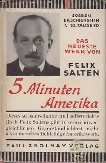 Fünf Minuten Amerika (German: “America in five minutes”) is a 1931 travel book by the Austrian writer Felix Salten, depicting his tour of 1930 in the United States of America. This is his second travel book, following his account of Palestine, Neue Menschen auf alter Erde, of 1925. Salten himself considered these two books to be his foremost.[1]
