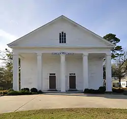 The building is in nearly original condition. It features white clapboard siding, a tin roof, a pedimented portico and five square masonry front columns constructed from brick reclaimed from the previous church building.[4] The pulpit and pews are original.[2]