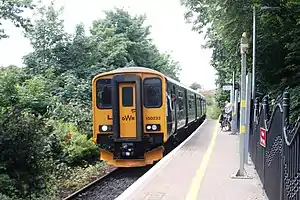 There is just one platform on the north side of the line (the side nearest the town centre) reached by a ramp from the car park. The platform is constructed from concrete slabs and piers, and a metal and glass waiting shelter is provided. The station is unstaffed but there is a ticket machine located at the bottom of the ramp to the platform.[3]