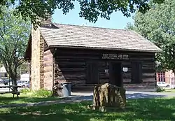 President Adams named David Hoge as Register.[5] He purchased a plot of land on the west side of Third Street from Bezaleel Wells, founder of Steubenville, and built a two-story log cabin as home and office.[6] In 1809, it was moved and 12 years later encased in a brick structure, where it was discovered in 1940, and preserved by citizens of Jefferson County, Ohio.[6]
