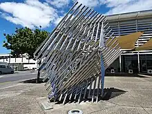 This large sculpture made of stacked steel tubes is about the coming together of diverse groups, including early Maori, European colonists and more recent migrants from Pacific Islands. It also suggests the ropework on their boats. Tohi said that he "sees the form as female, embracing, welcoming and encompassing local residents and visitors to the community."[26][27]