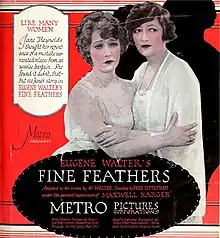 Fine Feathers is a 1921 American silent drama film directed by Fred Sittenham and starring Eugene Pallette, Claire Whitney, Thomas W. Ross, Warburton Gamble and June Elvidge, produced and distributed by Metro Pictures Corporation. The library of Congress shows a release date of June 20, 1921[1] but there is evidence that Fine Feathers was being screened on June 18 at the Rose Theater[2] in Santa Rosa California and as early as June 17 at the Star Theater in Monterey California.[3] This production is the second movie adaptation of Eugene Walter's 1912 play of the same name. Three complete 35 mm copies were donated by M.G.M. to the U.S. Archive.[1] A nitrate picture negative, an acetate positive print and an acetate fine grain master, all kept at the Eastman Museum in Rochester, NY.[4]