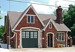It is a 1+1⁄2-story fire station which was designed to appear residential, with elements of Tudor Revival style.[2]