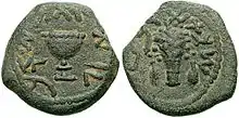 Bronze prutah eighth of a shekel of year 4 (6970 CE) issued during the First Jewish Revolt.