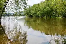 Most land around the oxbow is steep.[22] It is covered by hemlock and hardwood forests, as well as skunk cabbage seeps.[23] The forests around the lake also contain black birch, yellow birch, white oak, red oak, sugar maple, tulip poplar, and Norway maple, while the understory contains slippery elm, European privet, Japanese barberry, American elderberry, wild hydrangea, witch hazel, mountain laurel, ironwood, and the rare American yew. The American yew population was in significant decline by 2004 due to heavy grazing by deer.[23]