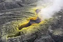 Elemental sulfur vapour rises from the Puʻu ʻŌʻō Crater in Hawaii. The cooled sulfur vapour product is the yellow, powdery substance around the crater.