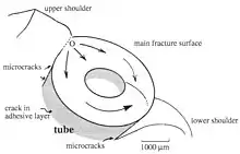 In the case of the failed breast implant catheter, the crack path was very simple, but the cause more subtle. Further scanning electron microscopy showed numerous microcracks between the bag and the catheter, indicating that the adhesive bond between the two components had failed prematurely, perhaps through faulty manufacture. The material of construction of both bag and catheter, silicone rubber is a physically weak elastomer, and product design must allow for the low tear or shear strength of the material.