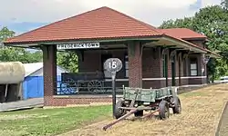 Fredericktown Missouri Pacific Railroad Depot, also known as the Fredericktown Depot, is a historic train station located at Fredericktown, Madison County, Missouri. It was built in 1917 by the St. Louis, Iron Mountain and Southern Railway, later Missouri Pacific Railroad. It is a one-story rectangular brick building with a low-pitched red tile hipped roof with Prairie School and Bungalow / American Craftsman style influences. It measures 22 feet by 128 feet, and features widely overhanging eaves supported by large curvilinear brackets and a projecting dispatcher's bay. In 1917–1918, the new Fredericktown Missouri Pacific Depot took over passenger service, while freight continued to be handled by the original St. Louis, Iron Mountain and Southern Railroad Depot. Passenger service to Fredericktown was discontinued in 1972 and the building subsequently used for commercial enterprises.[2]:5,9,11