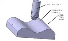 In manufacturing, freeform surface machining refers to the machining of complex surfaces that are not uniformly planar. The industries which most often manufactures free-form surfaces are basically aerospace, automotive, die mold industries, biomedical and power sector for turbine blades manufacturing. Generally 3- or 5-axis CNC milling machines are used for this purpose. The manufacturing process of freeform surfaces is not an easy job, as the tool path generation in present CAM technology is generally based on geometric computation so tool path are not optimum. The geometry can also be not described explicitly so errors and discontinuities occurrence in the solid structure cannot be avoided. Free-form surfaces are machined with the help of different tool path generation method like adaptive iso-planar tool path generation, constant scallop tool path generation, adaptive iso-parametric method, iso-curvature, isophote and by other methods. The different methods are chosen based on the parameters which is needed to be optimized.[1][2]