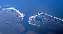 The Dutch West Frisian and the German East Frisian Islands are barrier islands.[1] They arose along the breakers' edge where the water surge piled up sediment, and behind which sediment was carried away by the breaking waves. Over time, shoals arose, which ultimately were only covered by infrequent storm floods.[1] Once plants began to colonize the sandbanks, the land began to stabilize.[2]