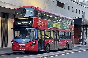 In June 2021, the world's first hydrogen fuel cell double-decker bus (Wright StreetDeck Hydroliner) entered service with Metroline in London on route 7.[68][4] These buses also entered service in Aberdeen, Scotland.[69] The Hydroliner FCEV was developed as part of the European Union 'Joint Initiative for Hydrogen Vehicles across Europe' (JIVE).[70]