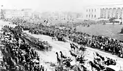 - Remark #2: April 19–21, 1865: lying in state in the U.S. Capitol rotunda. Arrival: April 19, 1865, 3 p.m. The procession started from the White House at 2 p.m. and proceeded up Pennsylvania Avenue to the Capitol amidst the tolling of bells and the firing of minute-guns. The funeral car was large. The lower base was fourteen feet [4.2 m] long and seven feet [2.1 m] wide, and eight feet [2.4 m] from the ground. The upper base, upon which the coffin rested, was eleven feet [3.4 m] long and five feet [1.5 m] below the top of the canopy. The canopy was surmounted by a gilt eagle, covered with crape. The hearse was entirely covered with cloth, velvet, crape and alpaca. The seat was covered with cloth, and on each side was a splendid lamp. The car was fifteen feet [4.6 m] high, and the coffin was so placed as to afford a full view to all spectators. It was drawn by six gray horses, each attended by a groom. The avenue was cleared the whole length... The sound of muffled drums was heard, and the procession, with a slow and measured tread, moved from the home of mourning on its mission with the remains of the illustrious dead. Despite the enormous crowd the silence was profound. The funeral car was carried up the steps of the Capitol, beneath the spot where, six weeks before, the president had delivered his second Inaugural, and into the rotunda, where the body was removed from the car to another catafalque, where a service was read. Here the procession dispersed, leaving the remains of the president in the rotunda, where they were open to view the next day—The public viewing started April 20, 1865 (early morning)-- Depart from U.S. Capitol: April 21, 1865, 7 a.m.; coffin moved to Washington's Baltimore & Ohio Railroad Depot