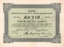 Share of the Aafa Althoff-Ambos-Film AG, issued 21. November 1921; signed by the principals Rudolf Dworsky and Gabriel Levy