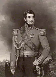 FitzClarence committed suicide at the age of 48 in London.[9] He shot himself with a pistol presented to him by King George IV, then Prince of Wales. The first shot only wounded his hand; while his footman went for help, having been told there had been an accident, Lord Munster put the gun in his mouth with his left hand and shot himself in the head.[10] His suicide came as no surprise to his family, who had long been concerned about his mental condition; his father's biographer attributes it to "a paranoiac sense of persecution."[11] At his inquest, his doctor and a surgeon told the coroner that they believed he was going mad, and in recent years there has been speculation that he suffered from the probably hereditary malady of porphyria which had afflicted his grandfather and several other members of the family.[12]