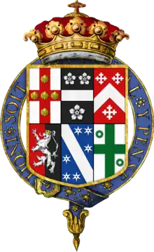 Villiers was appointed Lord High Admiral of England in 1619, and in 1623 the former dukedom of Buckingham was recreated for him when he was negotiating abroad on the king's behalf.[10] Since the dukedom of Norfolk had lapsed in 1572 with the attainder and execution of Thomas Howard, 4th Duke of Norfolk, Buckingham now became the only English duke who, at the time, was not a member of the royal family (James's two sons were Duke of Cornwall and Duke of York).[11]