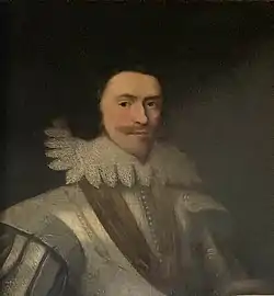 Villiers also commissioned portraits of himself as "a medium for the cultivation of his personal image".[52] William Larkin's portrait of 1616 records the start of his climb, showing him in the dress of a Knight of the Garter and emphasising the felicity of his stance and sumptuousness of dress.[53] A 1619 portrait by Daniel Mytens the Elder is equally elegant. There he is dressed in white brocade and white silk hose, wearing the Garter and standing in a decor of costly silks. Another full-length portrait by the same artist celebrates his succession as Lord High Admiral in 1619. Here he wears three-quarter armour; on the right, behind a balustrade, is a shoreline with the fleet beyond.[54] Buckingham's growing wealth was emphasised by the detail of his clothes. This is evident in the lovingly depicted lace about his collar and cuffs in the full-length portrait by Cornelis Janssens van Ceulen.[55] and the head and shoulders by Anthony van Dyck.[56] The 1625 painting by Michiel van Miereveld is not only of unparalleled magnificence, with a jacket encrusted with pearls which also hang in ropes across it, but may also contain a reference to his diplomatic coup that year in negotiating the marriage of the future Charles I. At his entry to the French Court, he is recorded as wearing a grey velvet suit from which the loosely threaded pearls dropped to the ground as he advanced to make his bow to the queen, to the general wonder.[57]
