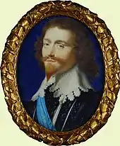 George Villiers, 1st Duke of Buckingham, KG (/ˈvɪlərz/ VIL-ərz; 28 August 1592 – 23 August 1628),[1][2] was an English courtier, statesman, and patron of the arts. He was a favourite and self-described "lover" of King James I of England.[3][4] Buckingham remained at the height of royal favour for the first three years of the reign of James's son, King Charles I, until a disgruntled army officer assassinated him.