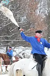 The sport was challenging, as the oiling of the goose's neck made it difficult to retain a grip on it, and the bird's flailing made it difficult to target in the first place. Sometimes the organisers would add an extra element of difficulty; one writer describing an event in the American South witnessed "a [man], with a long whip in hand ... stationed on a stump, about two rods [10 m / 32 ft] from the gander, with orders to strike the horse of the puller as he passed by."[28] The reaction of the startled horse would make it even more difficult for the puller to grab the goose as he went by. Many riders missed altogether; others broke the goose's neck without snapping off the head.[29] The American poet and novelist William Gilmore Simms wrote that