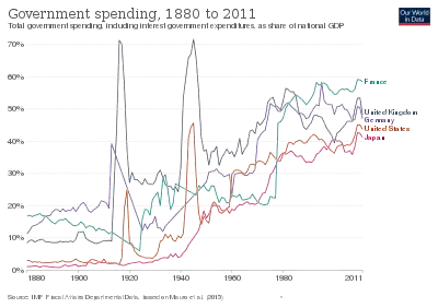 Government spending as percentage of GDP in different countries, 1890 to 2011