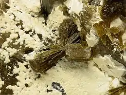 Greifensteinite is beryllium phosphate mineral with formula: Ca2Fe2+5Be4(PO4)6(OH)4·6H2O. It is the Fe2+ dominant member of the roscherite group.[5] It crystallizes in the monoclinic crystal system and typically forms prismatic dark olive green crystals.[2]