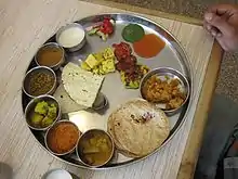 Gujarati thali prepared in Gujarati households has at least three fresh vegetable dishes, one dry dal or some sprouted pulses dish (ugaadayla mung, for instance), a wet dal, kadhi, kathor (a savoury), mithai, poori, rotis, steamed rice, chaash and papad.[2]
