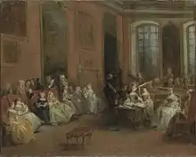 Étienne François, duc de Choiseul, acquired the hôtel by his marriage in 1750 to Louise-Honorine Crozat, daughter of Louis-François Crozat, marquis du Châtel.[8] Choiseul made numerous enhancements to the house until it became one of the most sumptuous in Paris. The interior was depicted by the miniaturist Louis-Nicolas Van Blarenberghe on the famous Choiseul snuffbox (c. 1770–1771).[9] The walls were covered with rather simple wood panelling, most of which was installed under the Crozats, and the parquet floors were made from exotic woods. His hôtel housed a large collection of important paintings,[10] consisting mainly of Dutch, Flemish, and French pictures, including eight works by Rembrandt.[11] Italian paintings inherited by his wife from her father were displayed in the Grand Gallery at their country estate, the Château de Chanteloup.[12]