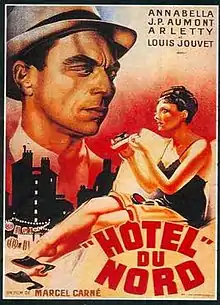 Hôtel du Nord is a 1938 French drama film directed by Marcel Carné that stars Arletty, Louis Jouvet, Annabella, and Jean-Pierre Aumont.[1] It tells the story of two couples in Paris, one being a prostitute and her pimp and the other two young lovers without regular jobs. A work of poetic realism, cinematography, music, and dialogue add a poetic dimension to the lives and surroundings of working-class people.