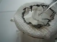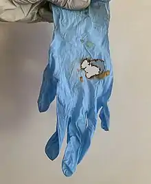 Nitrile glove exposed to drops of 98% sulfuric acid for 10 minutes