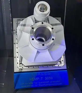 HEMPT 3050 is a satellite station-keeping Ion thruster, currently selected for the use on German Heinrich Hertz satellite. It's designed to be used for two roles: orbit-rising and station-keeping. To date it's been demonstrated to operate over 9000 hours.[1]
